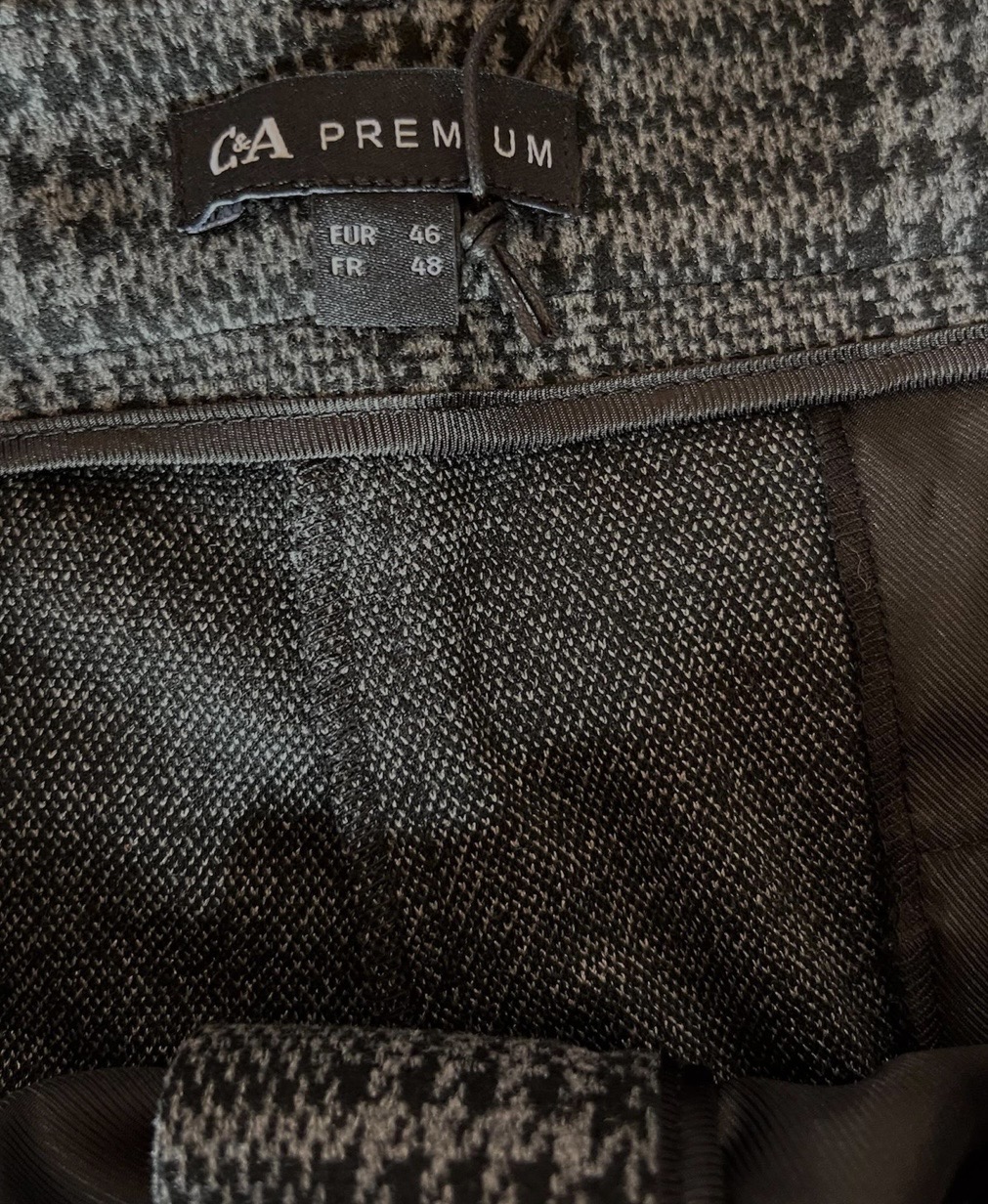 Tissu doux et confortable : mélange de polyester, viscose et 1% élasthanne Motif Prince-de-Galles élégant et professionnel Taille haute, coupe droite classique Fermeture avec bouton et zip, passants pour ceinture Poches latérales fonctionnelles Taille : 48 FR / 46 EU